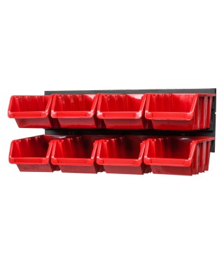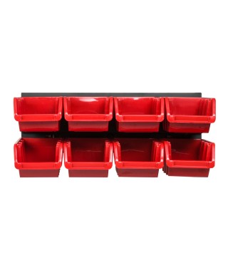 Ścianka warsztatowa wyposażona jest w wysokiej jakości pojemniki magazynowe wykonane z dbałością o detale. Stworzone z myślą o przechowywaniu sporej ilości różnych elementów zawierających się w wyposażenie warsztatu oraz innych drobiazgów, tj. gwoździe czy śrubki. Konstrukcja jest odporna na chemię oraz czynniki atmosferyczne. Ergonomiczny kształt pojemników umożliwia ich piętrowanie. Otwarty front zapewnia łatwy dostęp do zawartości pojemnika. Świetny dodatek stanowią wytrzymałe uchwyty i półki narzędziowe tj. młotek, wiertła, klucze, śrubokręt czy kombinerki. Dzięki uchwytom najważniejsze narzędzia będą zawsze pod ręką i zajmują znacznie mniej miejsca w warsztacie. Praktyczne oraz świetnie wyglądające rozwiązanie.