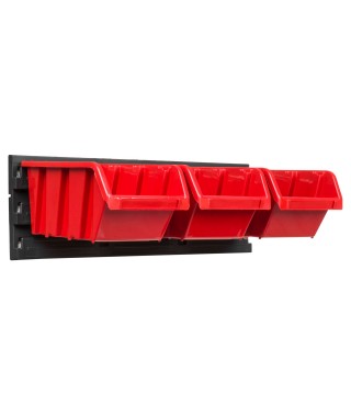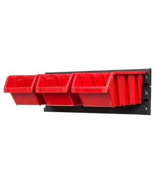 Ścianka warsztatowa wyposażona jest w wysokiej jakości pojemniki magazynowe wykonane z dbałością o detale. Stworzone z myślą o przechowywaniu sporej ilości różnych elementów zawierających się w wyposażenie warsztatu oraz innych drobiazgów, tj. gwoździe czy śrubki. Konstrukcja jest odporna na chemię oraz czynniki atmosferyczne. Ergonomiczny kształt pojemników umożliwia ich piętrowanie. Otwarty front zapewnia łatwy dostęp do zawartości pojemnika. Świetny dodatek stanowią wytrzymałe uchwyty i półki narzędziowe tj. młotek, wiertła, klucze, śrubokręt czy kombinerki. Dzięki uchwytom najważniejsze narzędzia będą zawsze pod ręką i zajmują znacznie mniej miejsca w warsztacie. Praktyczne oraz świetnie wyglądające rozwiązanie.