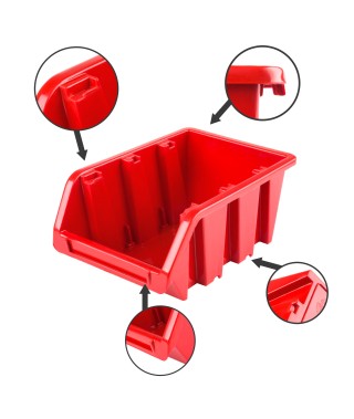 Ścianka warsztatowa wyposażona jest w wysokiej jakości pojemniki magazynowe wykonane z dbałością o detale. Stworzone z myślą o przechowywaniu sporej ilości różnych elementów zawierających się w wyposażenie warsztatu oraz innych drobiazgów, tj. gwoździe czy śrubki. Konstrukcja jest odporna na chemię oraz czynniki atmosferyczne. Ergonomiczny kształt pojemników umożliwia ich piętrowanie. Otwarty front zapewnia łatwy dostęp do zawartości pojemnika. Świetny dodatek stanowią wytrzymałe uchwyty i półki narzędziowe tj. młotek, wiertła, klucze, śrubokręt czy kombinerki. Dzięki uchwytom najważniejsze narzędzia będą zawsze pod ręką i zajmują znacznie mniej miejsca w warsztacie. Praktyczne oraz świetnie wyglądające rozwiązanie.
