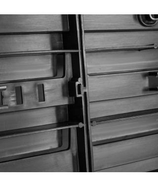 Ścianka warsztatowa wyposażona jest w wysokiej jakości pojemniki magazynowe wykonane z dbałością o detale. Stworzone z myślą o przechowywaniu sporej ilości różnych elementów zawierających się w wyposażenie warsztatu oraz innych drobiazgów, tj. gwoździe czy śrubki. Konstrukcja jest odporna na chemię oraz czynniki atmosferyczne. Ergonomiczny kształt pojemników umożliwia ich piętrowanie. Otwarty front zapewnia łatwy dostęp do zawartości pojemnika. Świetny dodatek stanowią wytrzymałe uchwyty i półki narzędziowe tj. młotek, wiertła, klucze, śrubokręt czy kombinerki. Dzięki uchwytom najważniejsze narzędzia będą zawsze pod ręką i zajmują znacznie mniej miejsca w warsztacie. Praktyczne oraz świetnie wyglądające rozwiązanie.