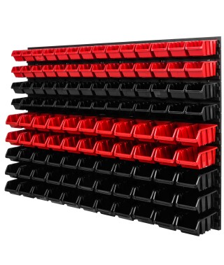 Ścianka warsztatowa wyposażona jest w wysokiej jakości pojemniki magazynowe wykonane z dbałością o detale. Stworzone z myślą o przechowywaniu sporej ilości różnych elementów zawierających się w wyposażenie warsztatu oraz innych drobiazgów, tj. gwoździe czy śrubki. Konstrukcja jest odporna na chemię oraz czynniki atmosferyczne. Ergonomiczny kształt pojemników umożliwia ich piętrowanie. Otwarty front zapewnia łatwy dostęp do zawartości pojemnika. Świetny dodatek stanowią wytrzymałe uchwyty i półki narzędziowe tj. młotek, wiertła, klucze, śrubokręt czy kombinerki. Dzięki uchwytom najważniejsze narzędzia będą zawsze pod ręką i zajmują znacznie mniej miejsca w warsztacie. Praktyczne oraz świetnie wyglądające rozwiązanie.