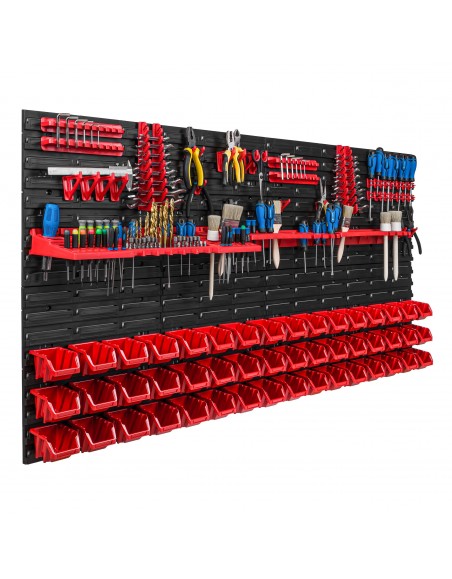 Ścianka warsztatowa wyposażona jest w wysokiej jakości pojemniki magazynowe wykonane z dbałością o detale. Stworzone z myślą o przechowywaniu sporej ilości różnych elementów zawierających się w wyposażenie warsztatu oraz innych drobiazgów, tj. gwoździe czy śrubki. Konstrukcja jest odporna na chemię oraz czynniki atmosferyczne. Ergonomiczny kształt pojemników umożliwia ich piętrowanie. Otwarty front zapewnia łatwy dostęp do zawartości pojemnika. Świetny dodatek stanowią wytrzymałe uchwyty i półki narzędziowe tj. młotek, wiertła, klucze, śrubokręt czy kombinerki. Dzięki uchwytom najważniejsze narzędzia będą zawsze pod ręką i zajmują znacznie mniej miejsca w warsztacie. Praktyczne oraz świetnie wyglądające rozwiązanie.