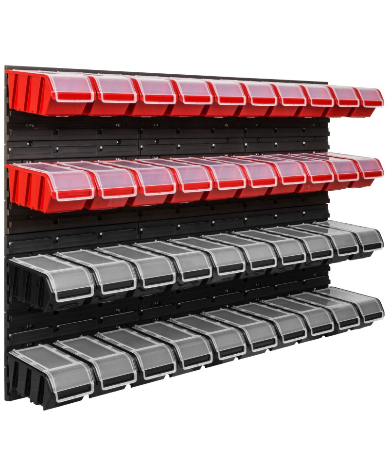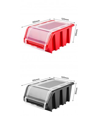 Ścianka warsztatowa wyposażona jest w wysokiej jakości pojemniki magazynowe wykonane z dbałością o detale. Stworzone z myślą o przechowywaniu sporej ilości różnych elementów zawierających się w wyposażenie warsztatu oraz innych drobiazgów, tj. gwoździe czy śrubki. Konstrukcja jest odporna na chemię oraz czynniki atmosferyczne. Ergonomiczny kształt pojemników umożliwia ich piętrowanie. Otwarty front zapewnia łatwy dostęp do zawartości pojemnika. Świetny dodatek stanowią wytrzymałe uchwyty i półki narzędziowe tj. młotek, wiertła, klucze, śrubokręt czy kombinerki. Dzięki uchwytom najważniejsze narzędzia będą zawsze pod ręką i zajmują znacznie mniej miejsca w warsztacie. Praktyczne oraz świetnie wyglądające rozwiązanie.