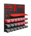 Ścianka warsztatowa wyposażona jest w wysokiej jakości pojemniki magazynowe wykonane z dbałością o detale. Stworzone z myślą o przechowywaniu sporej ilości różnych elementów zawierających się w wyposażenie warsztatu oraz innych drobiazgów, tj. gwoździe czy śrubki. Konstrukcja jest odporna na chemię oraz czynniki atmosferyczne. Ergonomiczny kształt pojemników umożliwia ich piętrowanie. Otwarty front zapewnia łatwy dostęp do zawartości pojemnika. Świetny dodatek stanowią wytrzymałe uchwyty i półki narzędziowe tj. młotek, wiertła, klucze, śrubokręt czy kombinerki. Dzięki uchwytom najważniejsze narzędzia będą zawsze pod ręką i zajmują znacznie mniej miejsca w warsztacie. Praktyczne oraz świetnie wyglądające rozwiązanie.