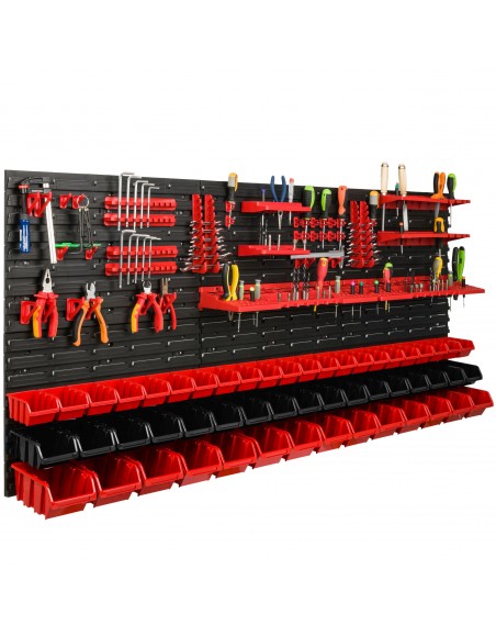 Ścianka warsztatowa wyposażona jest w wysokiej jakości pojemniki magazynowe wykonane z dbałością o detale. Stworzone z myślą o przechowywaniu sporej ilości różnych elementów zawierających się w wyposażenie warsztatu oraz innych drobiazgów, tj. gwoździe czy śrubki. Konstrukcja jest odporna na chemię oraz czynniki atmosferyczne. Ergonomiczny kształt pojemników umożliwia ich piętrowanie. Otwarty front zapewnia łatwy dostęp do zawartości pojemnika. Świetny dodatek stanowią wytrzymałe uchwyty i półki narzędziowe tj. młotek, wiertła, klucze, śrubokręt czy kombinerki. Dzięki uchwytom najważniejsze narzędzia będą zawsze pod ręką i zajmują znacznie mniej miejsca w warsztacie. Praktyczne oraz świetnie wyglądające rozwiązanie.