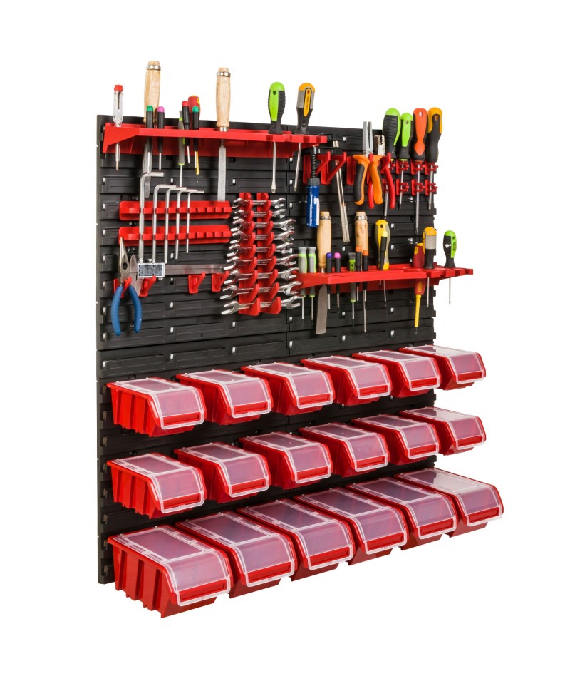 Ścianka warsztatowa wyposażona jest w wysokiej jakości pojemniki magazynowe wykonane z dbałością o detale. Stworzone z myślą o przechowywaniu sporej ilości różnych elementów zawierających się w wyposażenie warsztatu oraz innych drobiazgów, tj. gwoździe czy śrubki. Konstrukcja jest odporna na chemię oraz czynniki atmosferyczne. Ergonomiczny kształt pojemników umożliwia ich piętrowanie. Otwarty front zapewnia łatwy dostęp do zawartości pojemnika. Świetny dodatek stanowią wytrzymałe uchwyty i półki narzędziowe tj. młotek, wiertła, klucze, śrubokręt czy kombinerki. Dzięki uchwytom najważniejsze narzędzia będą zawsze pod ręką i zajmują znacznie mniej miejsca w warsztacie. Praktyczne oraz świetnie wyglądające rozwiązanie.