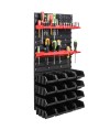 Ścianka warsztatowa wyposażona jest w wysokiej jakości pojemniki magazynowe wykonane z dbałością o detale. Stworzone z myślą o przechowywaniu sporej ilości różnych elementów zawierających się w wyposażenie warsztatu oraz innych drobiazgów, tj. gwoździe czy śrubki. Konstrukcja jest odporna na chemię oraz czynniki atmosferyczne. Ergonomiczny kształt pojemników umożliwia ich piętrowanie. Otwarty front zapewnia łatwy dostęp do zawartości pojemnika. Świetny dodatek stanowią wytrzymałe uchwyty i półki narzędziowe tj. młotek, wiertła, klucze, śrubokręt czy kombinerki. Dzięki uchwytom najważniejsze narzędzia będą zawsze pod ręką i zajmują znacznie mniej miejsca w warsztacie. Praktyczne oraz świetnie wyglądające rozwiązanie.