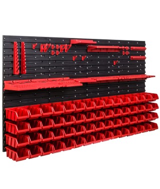 Ścianka warsztatowa wyposażona jest w wysokiej jakości pojemniki magazynowe wykonane z dbałością o detale. Stworzone z myślą o przechowywaniu sporej ilości różnych elementów zawierających się w wyposażenie warsztatu oraz innych drobiazgów, tj. gwoździe czy śrubki. Konstrukcja jest odporna na chemię oraz czynniki atmosferyczne. Ergonomiczny kształt pojemników umożliwia ich piętrowanie. Otwarty front zapewnia łatwy dostęp do zawartości pojemnika. Świetny dodatek stanowią wytrzymałe uchwyty i półki narzędziowe tj. młotek, wiertła, klucze, śrubokręt czy kombinerki. Dzięki uchwytom najważniejsze narzędzia będą zawsze pod ręką i zajmują znacznie mniej miejsca w warsztacie. Praktyczne oraz świetnie wyglądające rozwiązanie.