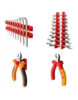 Jednym z najważniejszych elementów zestawu są uchwyty i półki narzędziowe, mocowane do tablicy w poziomie pozwalają na przejrzyste ułożenie wszystkich niezbędnych narzędzi. Niewykorzystana przestrzeń nad blatem roboczym to idealne miejsce na tablicę narzędziową, zapewniające dostęp na wyciągnięcie ręki. Prezentowany zestaw zawiera uchwyty i półki narzędziowe według specyfikacji: