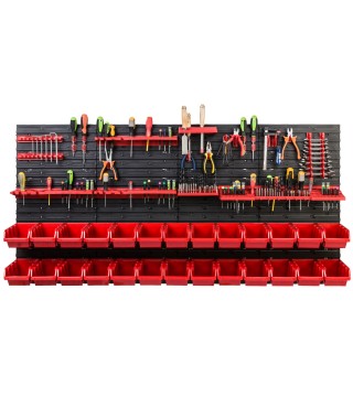 Ścianka warsztatowa wyposażona jest w wysokiej jakości pojemniki magazynowe wykonane z dbałością o detale. Stworzone z myślą o przechowywaniu sporej ilości różnych elementów zawierających się w wyposażenie warsztatu oraz innych drobiazgów, tj. gwoździe czy śrubki. Konstrukcja jest odporna na chemię oraz czynniki atmosferyczne. Ergonomiczny kształt pojemników umożliwia ich piętrowanie. Otwarty front zapewnia łatwy dostęp do zawartości pojemnika. Świetny dodatek stanowią wytrzymałe uchwyty i półki narzędziowe tj. młotek, wiertła, klucze, śrubokręt czy kombinerki. Dzięki uchwytom najważniejsze narzędzia będą zawsze pod ręką i zajmują znacznie mniej miejsca w warsztacie. Praktyczne oraz świetnie wyglądające rozwiązanie.