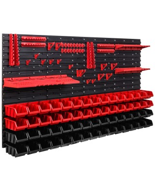 Ścianka warsztatowa wyposażona jest w wysokiej jakości pojemniki magazynowe wykonane z dbałością o detale. Stworzone z myślą o przechowywaniu sporej ilości różnych elementów zawierających się w wyposażenie warsztatu oraz innych drobiazgów, tj. gwoździe czy śrubki. Konstrukcja jest odporna na chemię oraz czynniki atmosferyczne. Ergonomiczny kształt pojemników umożliwia ich piętrowanie. Otwarty front zapewnia łatwy dostęp do zawartości pojemnika. Świetny dodatek stanowią wytrzymałe uchwyty i półki narzędziowe tj. młotek, wiertła, klucze, śrubokręt czy kombinerki. Dzięki uchwytom najważniejsze narzędzia będą zawsze pod ręką i zajmują znacznie mniej miejsca w warsztacie. Praktyczne oraz świetnie wyglądające rozwiązanie.