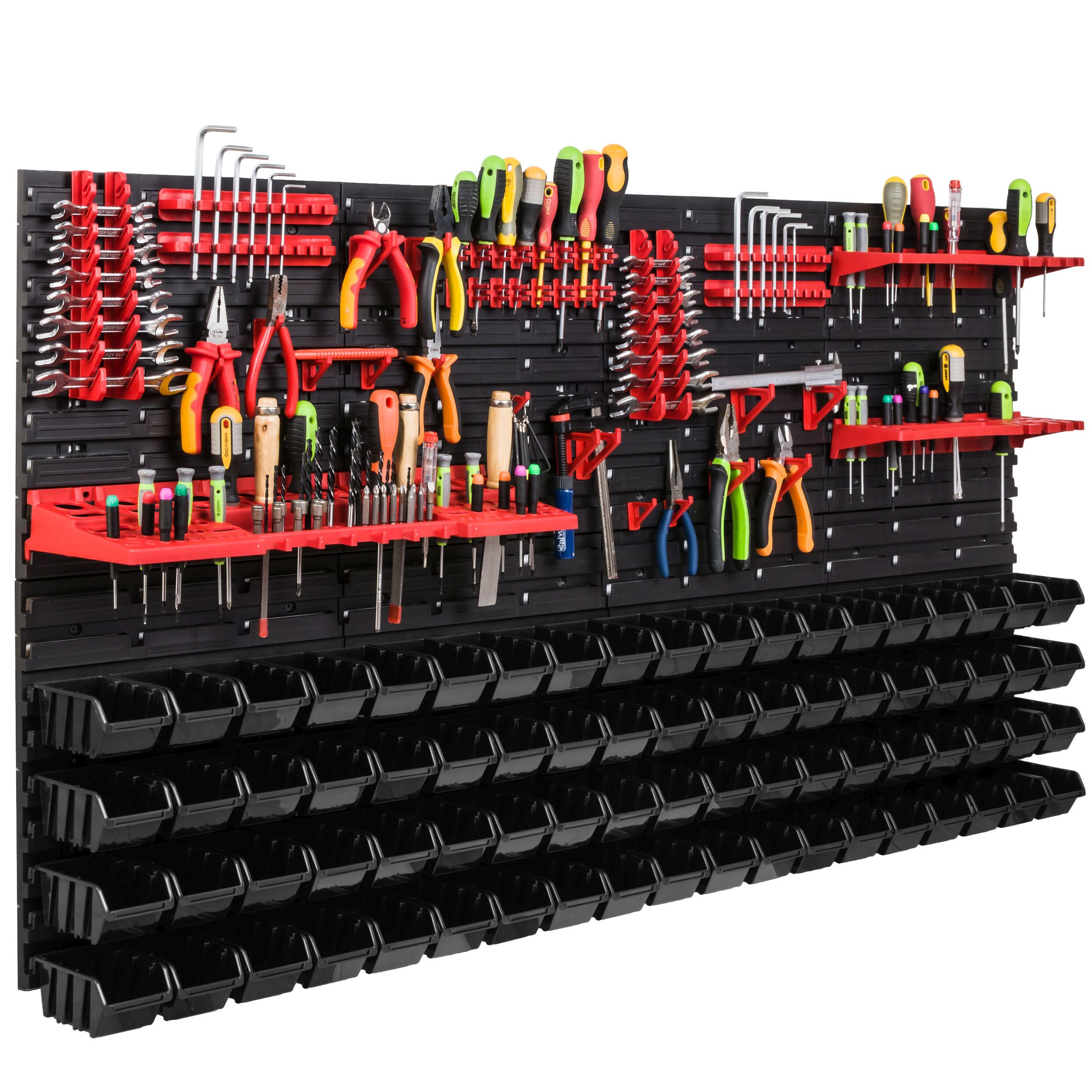 Ścianka warsztatowa wyposażona jest w wysokiej jakości pojemniki magazynowe wykonane z dbałością o detale. Stworzone z myślą o przechowywaniu sporej ilości różnych elementów zawierających się w wyposażenie warsztatu oraz innych drobiazgów, tj. gwoździe czy śrubki. Konstrukcja jest odporna na chemię oraz czynniki atmosferyczne. Ergonomiczny kształt pojemników umożliwia ich piętrowanie. Otwarty front zapewnia łatwy dostęp do zawartości pojemnika. Świetny dodatek stanowią wytrzymałe uchwyty i półki narzędziowe tj. młotek, wiertła, klucze, śrubokręt czy kombinerki. Dzięki uchwytom najważniejsze narzędzia będą zawsze pod ręką i zajmują znacznie mniej miejsca w warsztacie. Praktyczne oraz świetnie wyglądające rozwiązanie.