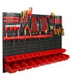 Ścianka warsztatowa wyposażona jest w wysokiej jakości pojemniki magazynowe wykonane z dbałością o detale. Stworzone z myślą o przechowywaniu sporej ilości różnych elementów zawierających się w wyposażenie warsztatu oraz innych drobiazgów, tj. gwoździe czy śrubki. Konstrukcja jest odporna na chemię oraz czynniki atmosferyczne. Ergonomiczny kształt pojemników umożliwia ich piętrowanie. Otwarty front zapewnia łatwy dostęp do zawartości pojemnika. Świetny dodatek stanowią wytrzymałe uchwyty i półki narzędziowe tj. młotek, wiertła, klucze, śrubokręt czy kombinerki. Dzięki uchwytom najważniejsze narzędzia będą zawsze pod ręką i zajmują znacznie mniej miejsca w warsztacie. Praktyczne oraz świetnie wyglądające rozwiązanie.