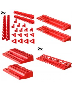 Jednym z najważniejszych elementów zestawu są uchwyty i półki narzędziowe, mocowane do tablicy w poziomie pozwalają na przejrzyste ułożenie wszystkich niezbędnych narzędzi. Niewykorzystana przestrzeń nad blatem roboczym to idealne miejsce na tablicę narzędziową, zapewniające dostęp na wyciągnięcie ręki. Prezentowany zestaw zawiera uchwyty i półki narzędziowe według specyfikacji: