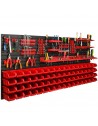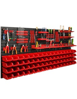 Ścianka warsztatowa wyposażona jest w wysokiej jakości pojemniki magazynowe wykonane z dbałością o detale. Stworzone z myślą o przechowywaniu sporej ilości różnych elementów zawierających się w wyposażenie warsztatu oraz innych drobiazgów, tj. gwoździe czy śrubki. Konstrukcja jest odporna na chemię oraz czynniki atmosferyczne. Ergonomiczny kształt pojemników umożliwia ich piętrowanie. Otwarty front zapewnia łatwy dostęp do zawartości pojemnika. Świetny dodatek stanowią wytrzymałe uchwyty i półki narzędziowe tj. młotek, wiertła, klucze, śrubokręt czy kombinerki. Dzięki uchwytom najważniejsze narzędzia będą zawsze pod ręką i zajmują znacznie mniej miejsca w warsztacie. Praktyczne oraz świetnie wyglądające rozwiązanie.