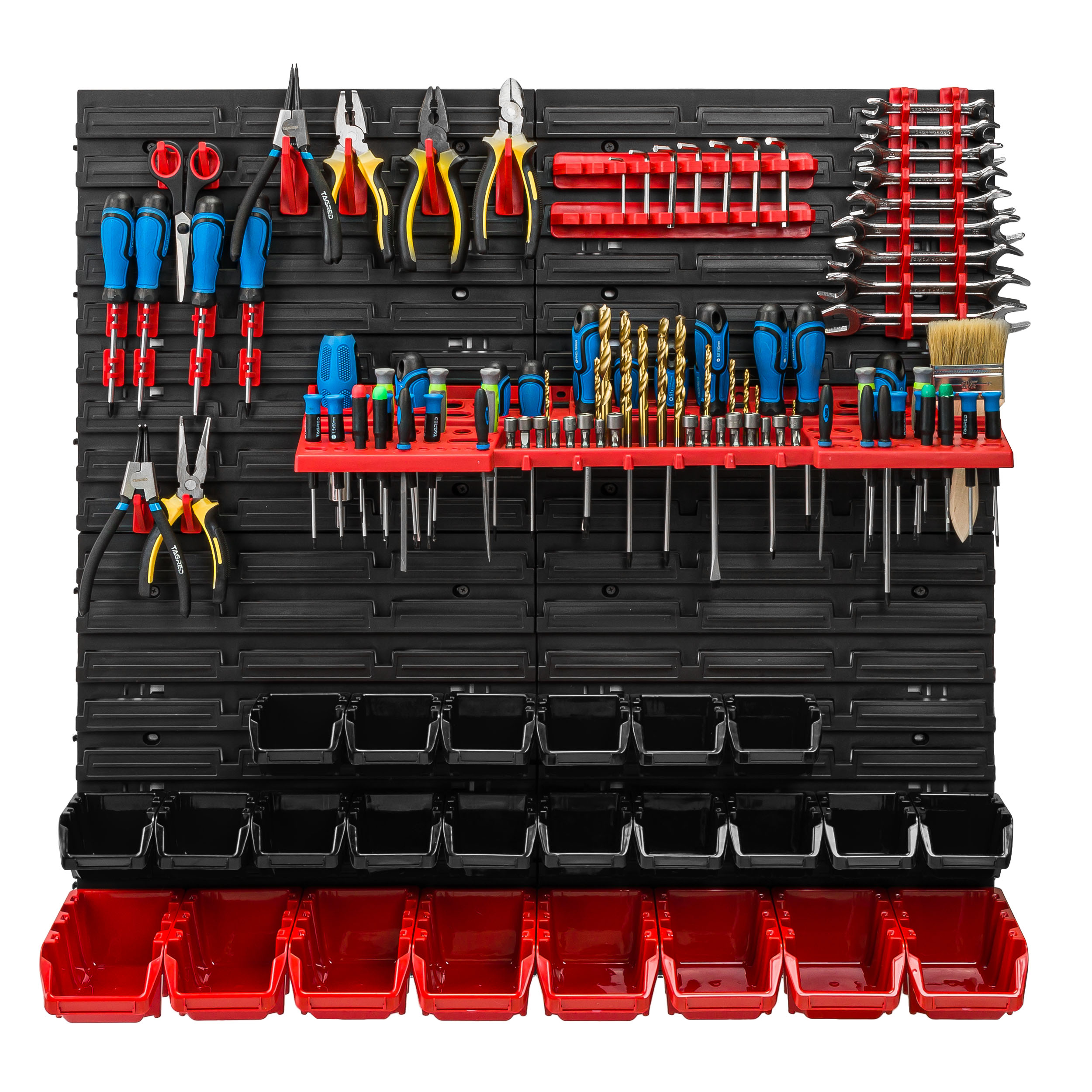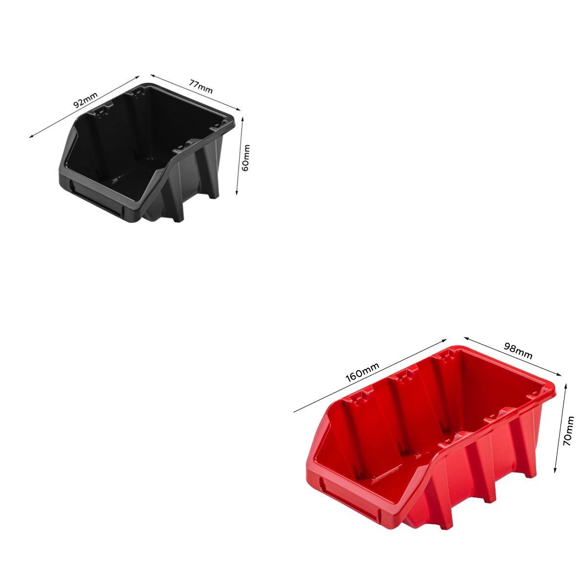 Ścianka warsztatowa wyposażona jest w wysokiej jakości pojemniki magazynowe wykonane z dbałością o detale. Stworzone z myślą o przechowywaniu sporej ilości różnych elementów zawierających się w wyposażenie warsztatu oraz innych drobiazgów, tj. gwoździe czy śrubki. Konstrukcja jest odporna na chemię oraz czynniki atmosferyczne. Ergonomiczny kształt pojemników umożliwia ich piętrowanie. Otwarty front zapewnia łatwy dostęp do zawartości pojemnika. Świetny dodatek stanowią wytrzymałe uchwyty i półki narzędziowe tj. młotek, wiertła, klucze, śrubokręt czy kombinerki. Dzięki uchwytom najważniejsze narzędzia będą zawsze pod ręką i zajmują znacznie mniej miejsca w warsztacie. Praktyczne oraz świetnie wyglądające rozwiązanie.