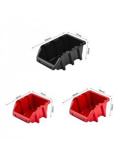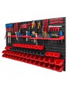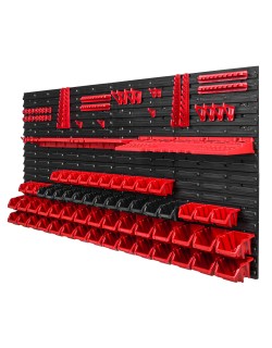 Ścianka warsztatowa wyposażona jest w wysokiej jakości pojemniki magazynowe wykonane z dbałością o detale. Stworzone z myślą o przechowywaniu sporej ilości różnych elementów zawierających się w wyposażenie warsztatu oraz innych drobiazgów, tj. gwoździe czy śrubki. Konstrukcja jest odporna na chemię oraz czynniki atmosferyczne. Ergonomiczny kształt pojemników umożliwia ich piętrowanie. Otwarty front zapewnia łatwy dostęp do zawartości pojemnika. Świetny dodatek stanowią wytrzymałe uchwyty i półki narzędziowe tj. młotek, wiertła, klucze, śrubokręt czy kombinerki. Dzięki uchwytom najważniejsze narzędzia będą zawsze pod ręką i zajmują znacznie mniej miejsca w warsztacie. Praktyczne oraz świetnie wyglądające rozwiązanie.
