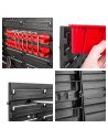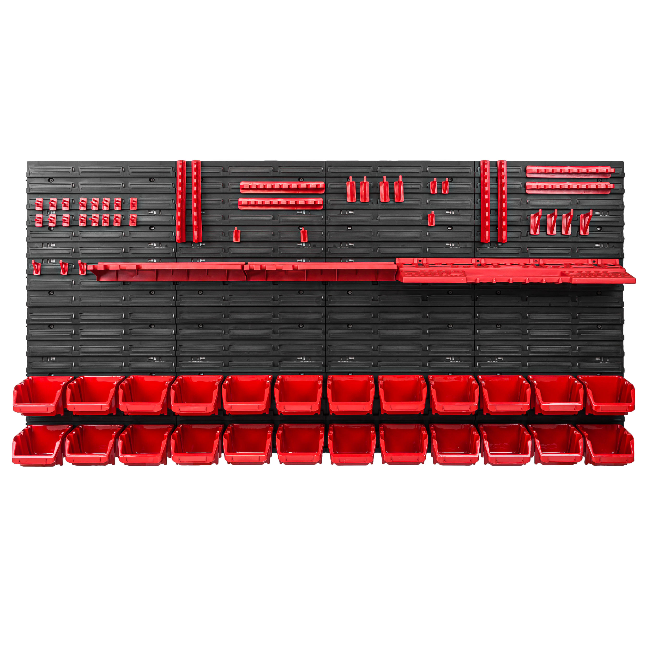 Ścianka warsztatowa wyposażona jest w wysokiej jakości pojemniki magazynowe wykonane z dbałością o detale. Stworzone z myślą o przechowywaniu sporej ilości różnych elementów zawierających się w wyposażenie warsztatu oraz innych drobiazgów, tj. gwoździe czy śrubki. Konstrukcja jest odporna na chemię oraz czynniki atmosferyczne. Ergonomiczny kształt pojemników umożliwia ich piętrowanie. Otwarty front zapewnia łatwy dostęp do zawartości pojemnika. Świetny dodatek stanowią wytrzymałe uchwyty i półki narzędziowe tj. młotek, wiertła, klucze, śrubokręt czy kombinerki. Dzięki uchwytom najważniejsze narzędzia będą zawsze pod ręką i zajmują znacznie mniej miejsca w warsztacie. Praktyczne oraz świetnie wyglądające rozwiązanie.