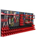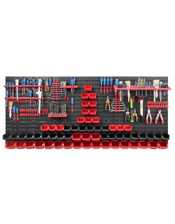 Ścianka warsztatowa wyposażona jest w wysokiej jakości pojemniki magazynowe wykonane z dbałością o detale. Stworzone z myślą o przechowywaniu sporej ilości różnych elementów zawierających się w wyposażenie warsztatu oraz innych drobiazgów, tj. gwoździe czy śrubki. Konstrukcja jest odporna na chemię oraz czynniki atmosferyczne. Ergonomiczny kształt pojemników umożliwia ich piętrowanie. Otwarty front zapewnia łatwy dostęp do zawartości pojemnika. Świetny dodatek stanowią wytrzymałe uchwyty i półki narzędziowe tj. młotek, wiertła, klucze, śrubokręt czy kombinerki. Dzięki uchwytom najważniejsze narzędzia będą zawsze pod ręką i zajmują znacznie mniej miejsca w warsztacie. Praktyczne oraz świetnie wyglądające rozwiązanie.