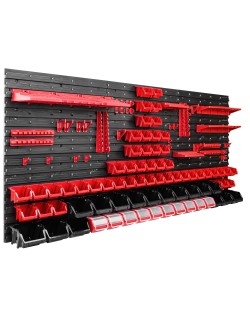 Ścianka warsztatowa wyposażona jest w wysokiej jakości pojemniki magazynowe wykonane z dbałością o detale. Stworzone z myślą o przechowywaniu sporej ilości różnych elementów zawierających się w wyposażenie warsztatu oraz innych drobiazgów, tj. gwoździe czy śrubki. Konstrukcja jest odporna na chemię oraz czynniki atmosferyczne. Ergonomiczny kształt pojemników umożliwia ich piętrowanie. Otwarty front zapewnia łatwy dostęp do zawartości pojemnika. Świetny dodatek stanowią wytrzymałe uchwyty i półki narzędziowe tj. młotek, wiertła, klucze, śrubokręt czy kombinerki. Dzięki uchwytom najważniejsze narzędzia będą zawsze pod ręką i zajmują znacznie mniej miejsca w warsztacie. Praktyczne oraz świetnie wyglądające rozwiązanie.