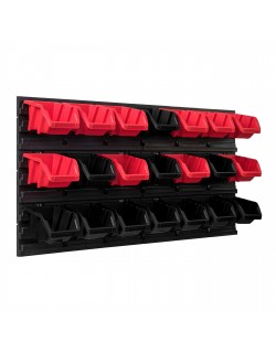 Ścianka warsztatowa wyposażona jest w wysokiej jakości pojemniki magazynowe wykonane z dbałością o detale. Stworzone z myślą o przechowywaniu sporej ilości różnych elementów zawierających się w wyposażenie warsztatu oraz innych drobiazgów, tj. gwoździe czy śrubki. Konstrukcja jest odporna na chemię oraz czynniki atmosferyczne. Ergonomiczny kształt pojemników umożliwia ich piętrowanie. Otwarty front zapewnia łatwy dostęp do zawartości pojemnika. Świetny dodatek stanowią wytrzymałe uchwyty i półki narzędziowe tj. młotek, wiertła, klucze, śrubokręt czy kombinerki. Dzięki uchwytom najważniejsze narzędzia będą zawsze pod ręką i zajmują znacznie mniej miejsca w warsztacie. Praktyczne oraz świetnie wyglądające rozwiązanie.