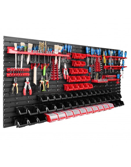 Ścianka warsztatowa wyposażona jest w wysokiej jakości pojemniki magazynowe wykonane z dbałością o detale. Stworzone z myślą o przechowywaniu sporej ilości różnych elementów zawierających się w wyposażenie warsztatu oraz innych drobiazgów, tj. gwoździe czy śrubki. Konstrukcja jest odporna na chemię oraz czynniki atmosferyczne. Ergonomiczny kształt pojemników umożliwia ich piętrowanie. Otwarty front zapewnia łatwy dostęp do zawartości pojemnika. Świetny dodatek stanowią wytrzymałe uchwyty i półki narzędziowe tj. młotek, wiertła, klucze, śrubokręt czy kombinerki. Dzięki uchwytom najważniejsze narzędzia będą zawsze pod ręką i zajmują znacznie mniej miejsca w warsztacie. Praktyczne oraz świetnie wyglądające rozwiązanie.