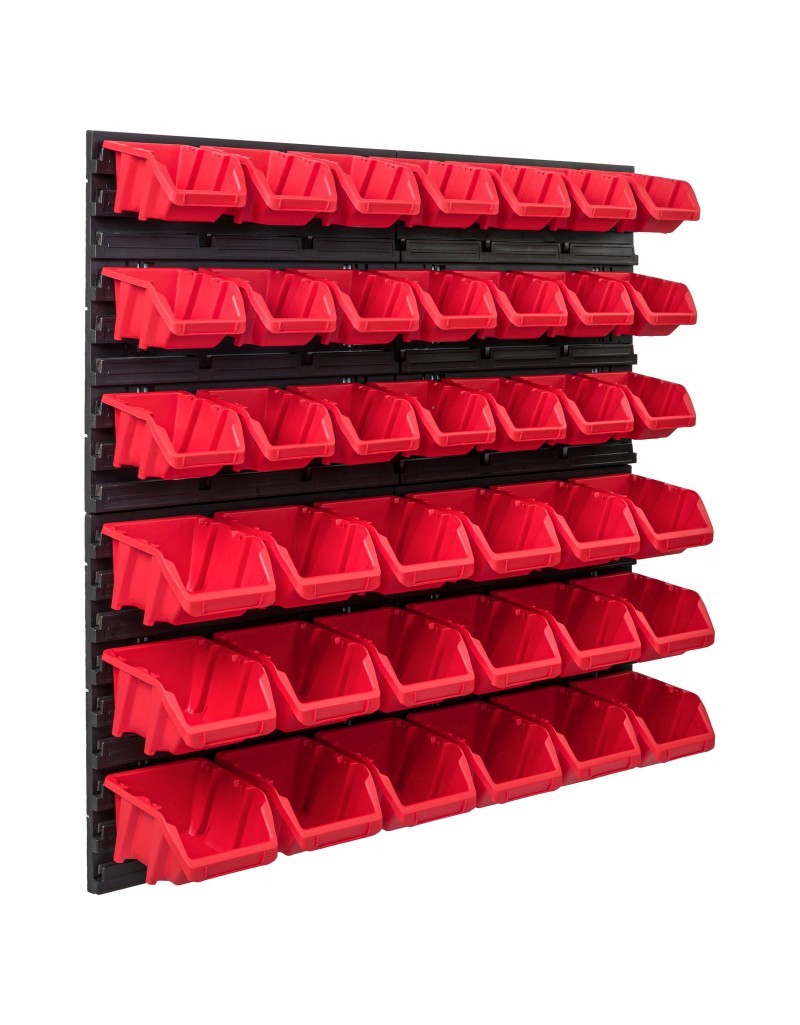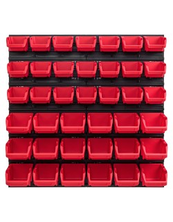 Ścianka warsztatowa wyposażona jest w wysokiej jakości pojemniki magazynowe wykonane z dbałością o detale. Stworzone z myślą o przechowywaniu sporej ilości różnych elementów zawierających się w wyposażenie warsztatu oraz innych drobiazgów, tj. gwoździe czy śrubki. Konstrukcja jest odporna na chemię oraz czynniki atmosferyczne. Ergonomiczny kształt pojemników umożliwia ich piętrowanie. Otwarty front zapewnia łatwy dostęp do zawartości pojemnika. Świetny dodatek stanowią wytrzymałe uchwyty i półki narzędziowe tj. młotek, wiertła, klucze, śrubokręt czy kombinerki. Dzięki uchwytom najważniejsze narzędzia będą zawsze pod ręką i zajmują znacznie mniej miejsca w warsztacie. Praktyczne oraz świetnie wyglądające rozwiązanie.