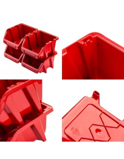 Ścianka warsztatowa wyposażona jest w wysokiej jakości pojemniki magazynowe wykonane z dbałością o detale. Stworzone z myślą o przechowywaniu sporej ilości różnych elementów zawierających się w wyposażenie warsztatu oraz innych drobiazgów, tj. gwoździe czy śrubki. Konstrukcja jest odporna na chemię oraz czynniki atmosferyczne. Ergonomiczny kształt pojemników umożliwia ich piętrowanie. Otwarty front zapewnia łatwy dostęp do zawartości pojemnika. Świetny dodatek stanowią wytrzymałe uchwyty i półki narzędziowe tj. młotek, wiertła, klucze, śrubokręt czy kombinerki. Dzięki uchwytom najważniejsze narzędzia będą zawsze pod ręką i zajmują znacznie mniej miejsca w warsztacie. Praktyczne oraz świetnie wyglądające rozwiązanie.